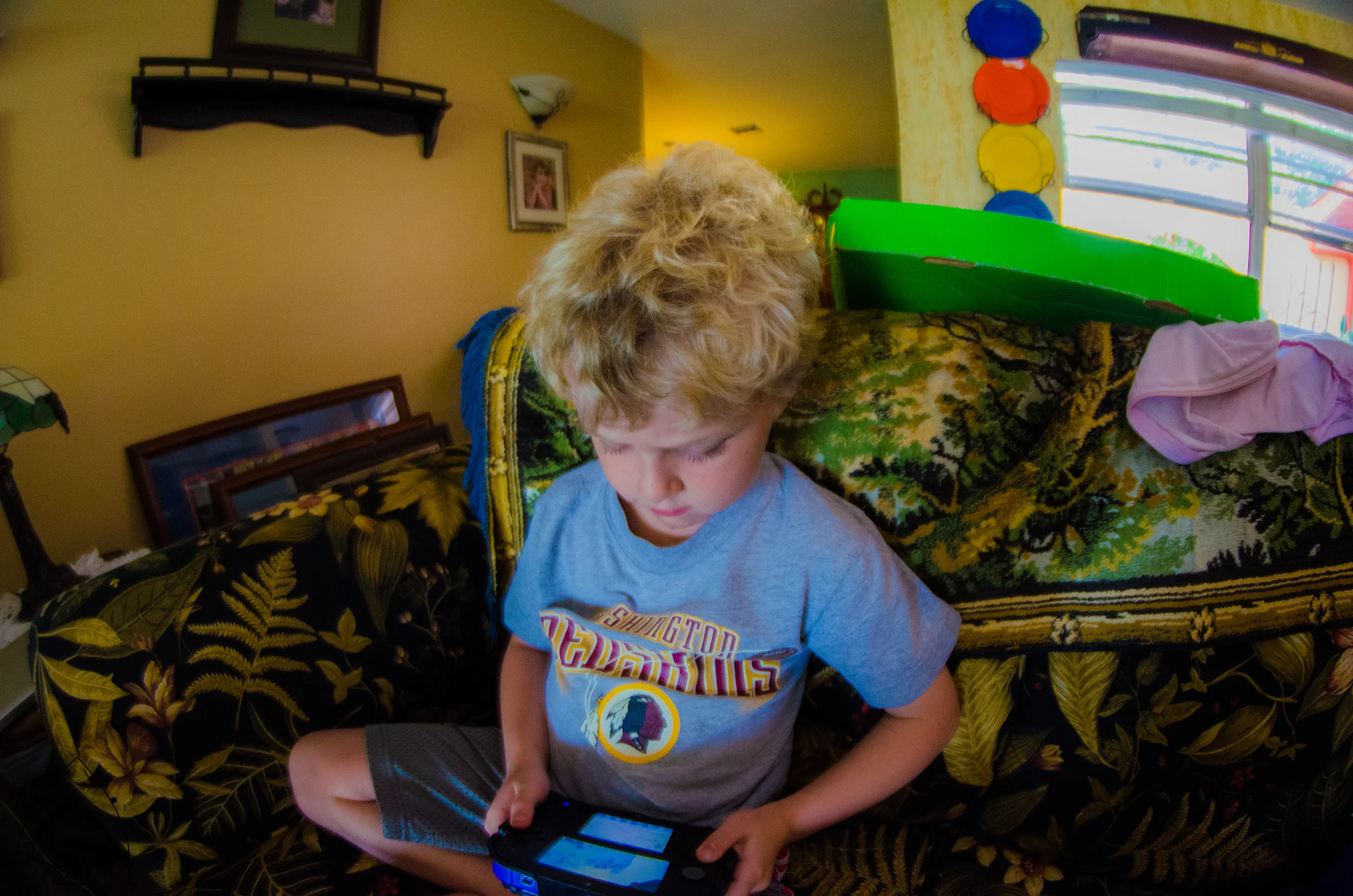 How about this somewhat blurry picture (Stupid fisheye) of my baby brother Sparky Marky? I'm pretty sure he is playing Pokemon Y trying to catch up to where I am in X. He is so serious when he plays too. He always tries to impress me or show off when he's playing because he wants to be either like me or better than me.